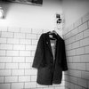 A babushka in a charcoal coat